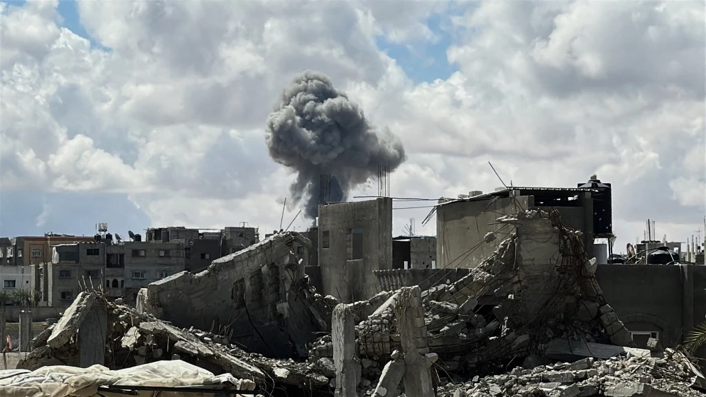 ![Izraelscy żołnierze wpadli w pułapkę w tunelu w Rafah [zdj. ilustracyjne] Zniszczone budynki z widocznymi ruinami i unoszącym się dymem na tle nieba, co wskazuje na niedawną eksplozję lub atak.](https://i.iplsc.com/000KZOM746J9PPIG-C323-F4.webp)