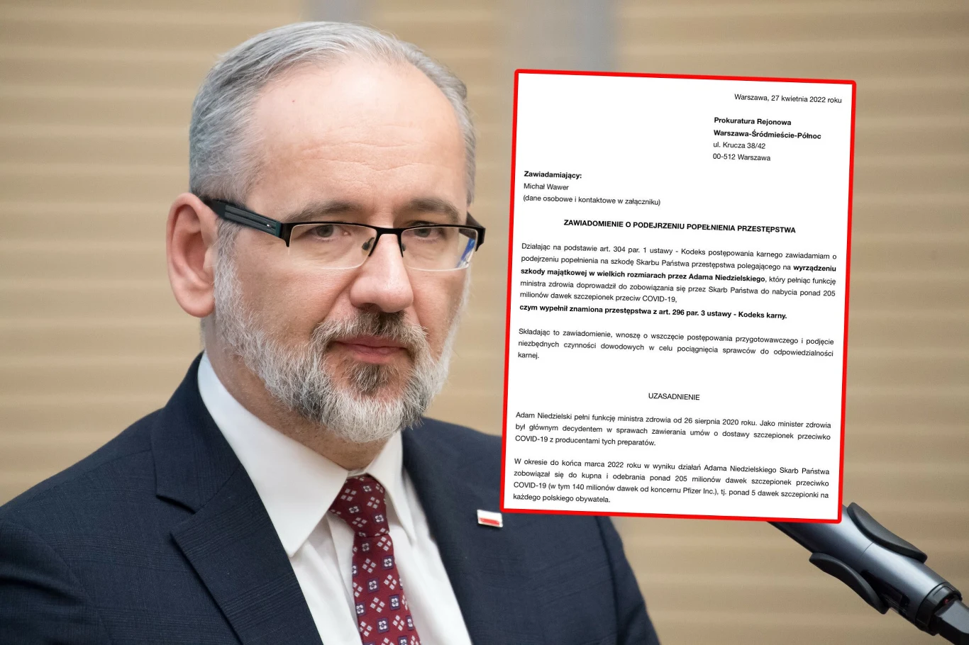 W uzasadnieniu zawiadomienia mec. Wawer zwrócił uwagę, że Niedzielski był "głównym decydentem w sprawach zawierania umów o dostawy szczepionek przeciwko COVID-19 z producentami tych preparatów". Wskazał ponadto, iż wskutek działań Niedzielskiego, "Skarb Państwa zobowiązał się do kupna i odebrania ponad 205 milionów dawek szczepionek przeciwko COVID-19, w tym 140 milionów dawek od koncernu Pfizer Inc., tj. ponad pięciu dawek szczepionki na każdego polskiego obywatela".