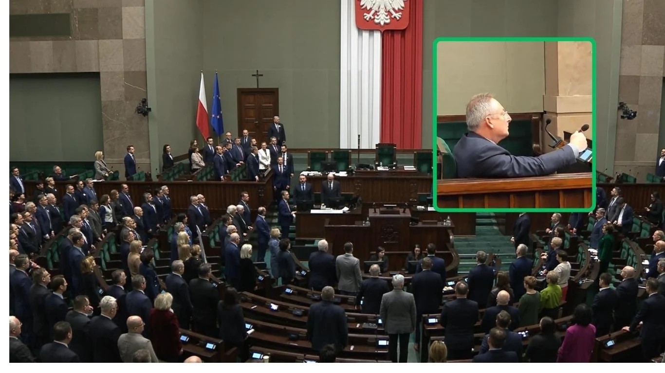 Na transmisji z posiedzenia Sejmu widać, że jeden z posłów wytrwale siedzi podczas odśpiewywania pieśni - był nim minister kultury i dziedzictwa narodowego Bartłomiej Sienkiewicz. Jego zachowanie wypomniał mu w mediach społecznościowychRadosław Fogiel (PiS). "Skandaliczne zachowanie. Gdy w Sejmie rozbrzmiał Mazurek Dąbrowskiego, pułkownik minister Sienkiewicz nie wstał i ostentacyjnie siedział przez cały hymn" - napisał na X i dodał nagranie z sali.