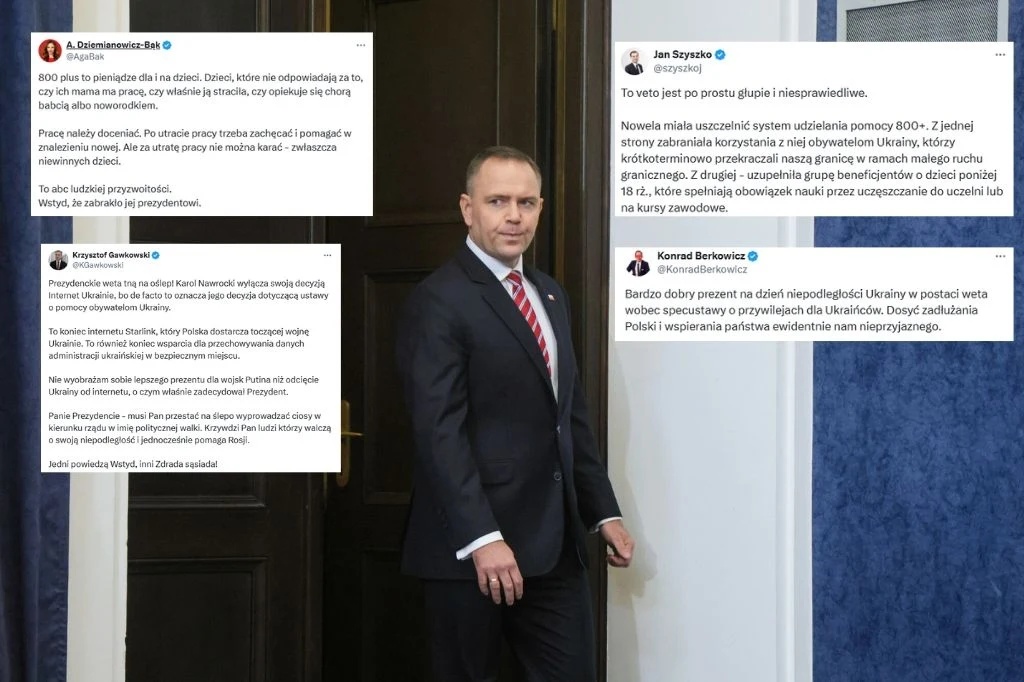 "Za utratę pracy nie można karać - zwłaszcza niewinnych dzieci. To ABC ludzkiej przyzwoitości. Zabrakło jej prezydentowi" - stwierdziła minister rodziny, pracy i polityki społecznej Agnieszce Dziemianowicz-Bąk komentując weto prezydenta Karola Nawrockiego ustawy o pomocy obywatelom Ukrainy. Prezydenta pochwalili z kolei politycy Konfederacji. "Dosyć zadłużania Polski i wspierania państwa ewidentnie nam nieprzyjaznego" - napisał Konrad Berkowicz.