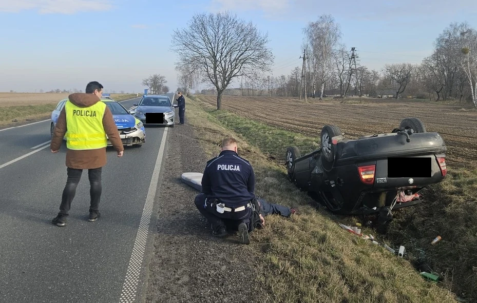 Na drodze krajowej 83 w okolicach miejscowości Tądów Dolny auto wjechało do rowu i dachowało. Kierowca był przytomny i został obezwładniony przez funkcjonariuszy.