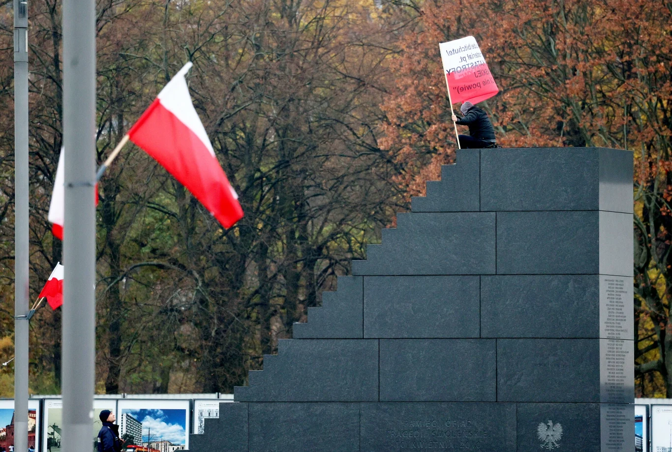 W sobotę o godz. 13.20 do Komendy Stołecznej Policji wpłynęła wiadomość, że nieznany mężczyzna wszedł na pomnik Ofiar Tragedii Smoleńskiej na placu Piłsudskiego w Warszawie i ma przy sobie przedmiot przypominający broń. Trzymał także polską flagę z widocznym napisem odsyłającym do strony internetowej.