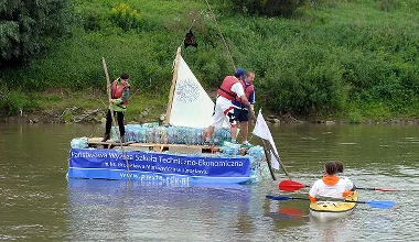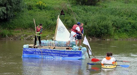 Studenci płyną na tratwie z plastikowych butelek