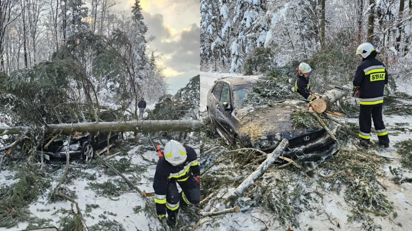 Obciążone śniegiem drzewo spadło wprost na auto osobowe w Targowiskach na Podkarpaciu i całkowicie zablokowało przejazd - przekazała tamtejsza OSP. Kierowcy nic się nie stało, a całe zdarzenie zarejestrowała kamerka samochodowa.