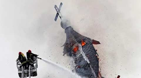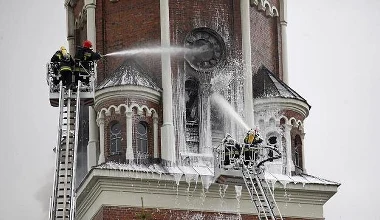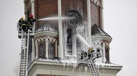 Strażacy dogaszają pożar wieży kościoła w Białymstoku