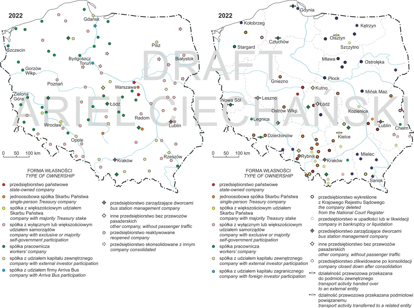 Na najnowszych mapach Ciechańskiego widzimy różnicę między 2006 a obecnym rokiem. Używając kształtów - kropek, gwiazdek itd. - oraz kolorów autor podzielił działające do dziś spółki ze względu na ich formę własności.