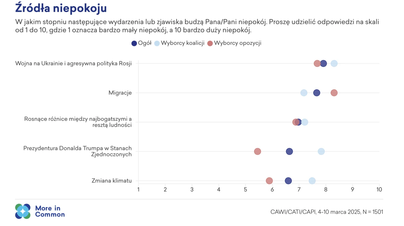 Co wywołuje obecnie największy niepokój Polaków? Zdecydowany prym wiodą tutaj wojna w Ukrainie i agresywna polityka Rosji (7,91), a także migracje (7,66). Wyraźnie mniejszy lęk wzbudzają rosnące nierówności między najbogatszymi i resztą społeczeństwa (6,97), prezydentura Donalda Trumpa w Stanach Zjednoczonych (6,64), a także zmiana klimatu (6,6).