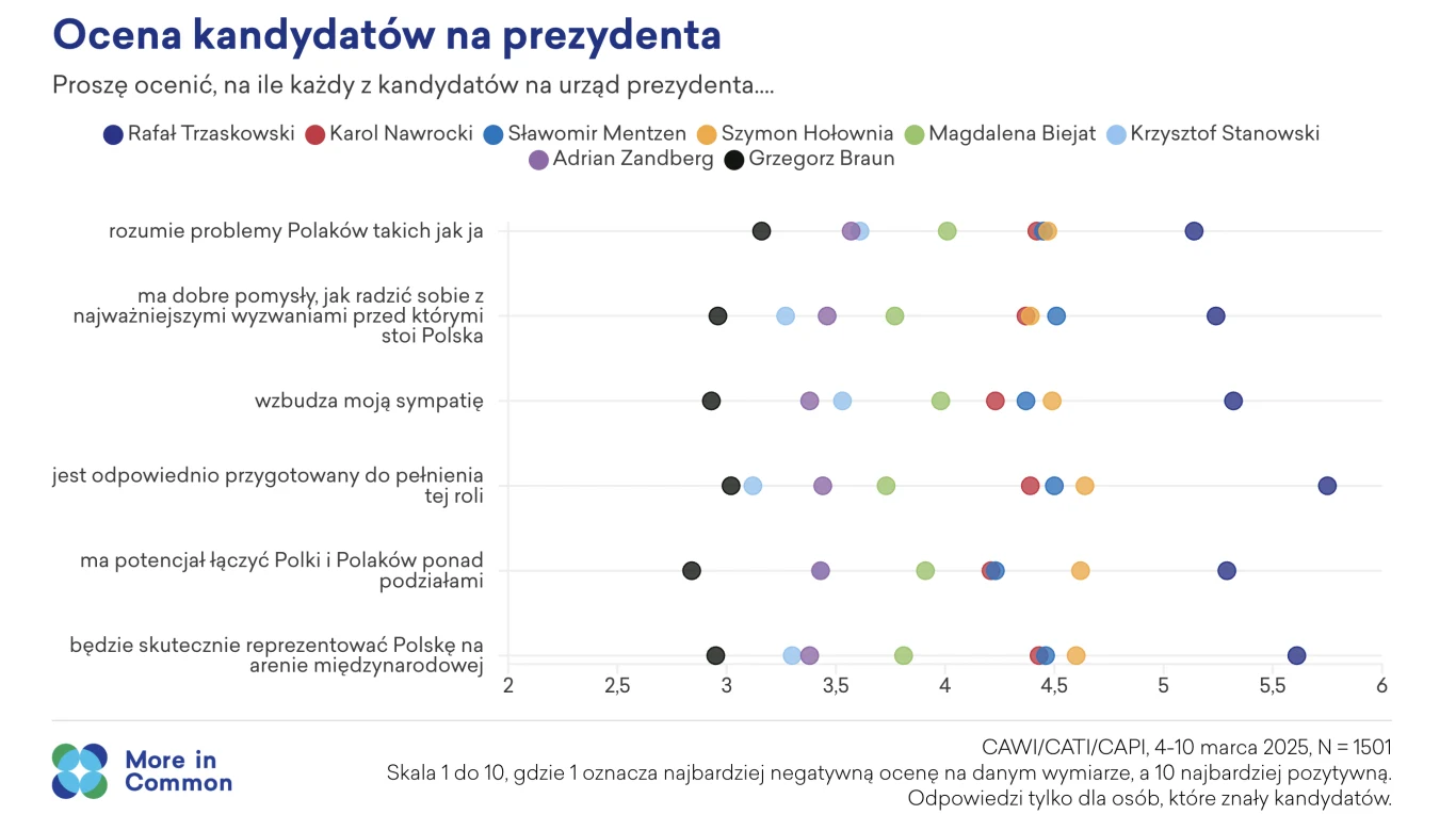 Wobec powyższych wyzwań i obaw społeczeństwa, badacze zapytali Polaków, który z kandydatów na prezydenta ma najlepsze kwalifikacje do tego, żeby poradzić sobie z obecną sytuacją. Respondenci oceniali więc, ponownie na skali 1-10, na ile kandydaci rozumieją potrzeby zwykłych ludzi, czy mają pomysły jak poradzić sobie z wyzwaniami stojącymi przed Polską, czy wzbudzają sympatię, czy są odpowiednio przygotowani do pełnienia funkcji prezydenta, czy mają potencjał do łączenia Polek i Polaków ponad politycznymi podziałami, a także czy będą skutecznie reprezentować Polskę na arenie międzynarodowej.