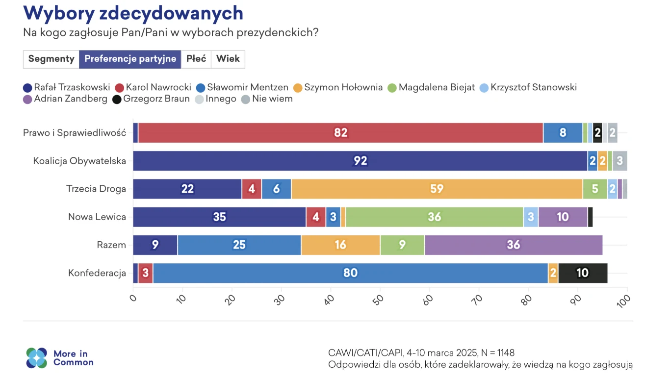 Interesujących obserwacji dostarczają preferencje zdecydowanych wyborców, gdy spojrzymy na nie przez pryzmat sympatii partyjnych. Zdecydowanie najlepiej swój bazowy elektorat potrafił zagospodarować Rafał Trzaskowski - aż 92 proc. elektoratu Koalicji Obywatelskiej zamierza poprzeć prezydenta Warszawy. W przypadku Karola Nawrockiego i wyborców PiS-u jest to wynik o 10 pkt proc. niższy. Z kolei Sławomira Mentzena planuje wesprzeć swoim głosem 80 proc. wyborców Konfederacji.