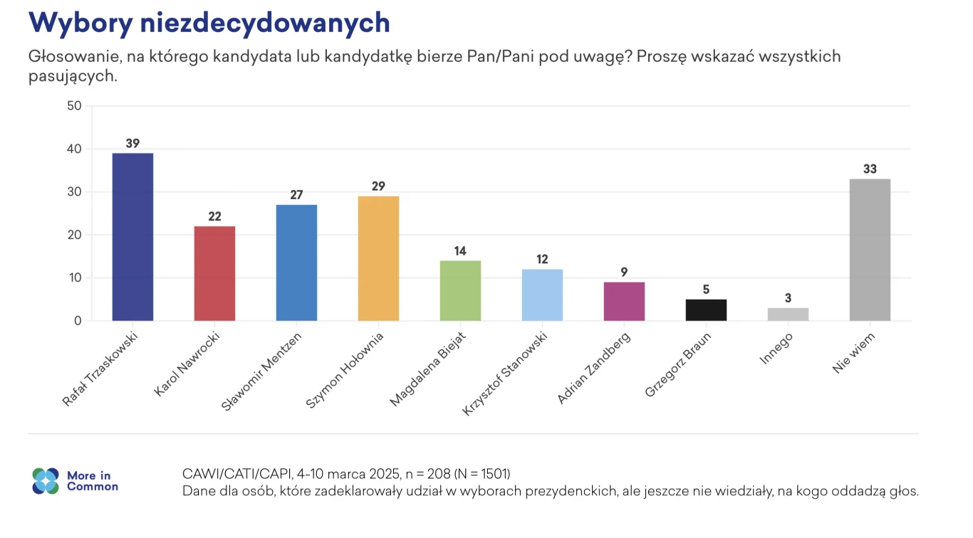 Tyle wyborcy zdecydowani. A co z niezdecydowanymi, o których w każdych wyborach toczy się najzagorzalszy bój? Pytani o to, na kogo rozważają oddanie swojego głosu, w pierwszej kolejności wymieniają Trzaskowskiego (39 proc.). Na dalszych pozycjach znaleźli się Hołownia (29), Mentzen (27) i Nawrocki (22). Jednak aż 33 proc. tej grupy nie potrafi wskazać, ku komu się skłania. Zastrzeżenie: każdy respondent mógł przy tym pytaniu wskazać kilka nazwisk.