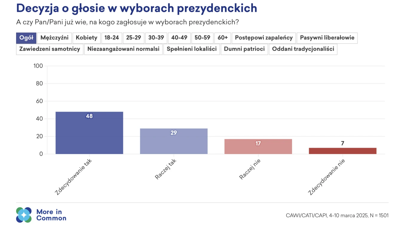 Na półtora miesiąca przed wyborami prezydenckimi tylko 48 proc. społeczeństwa ma pewność, na kogo odda swój głos. Niespełna jedna trzecia (29 proc.) skłania się ku jakiemuś kandydatowi. Kolejne 17 proc. raczej nie wie, kogo poprze 18 maja, a co czternasty wyborca nie ma pojęcia, przy czyim nazwisku postawi krzyżyk.