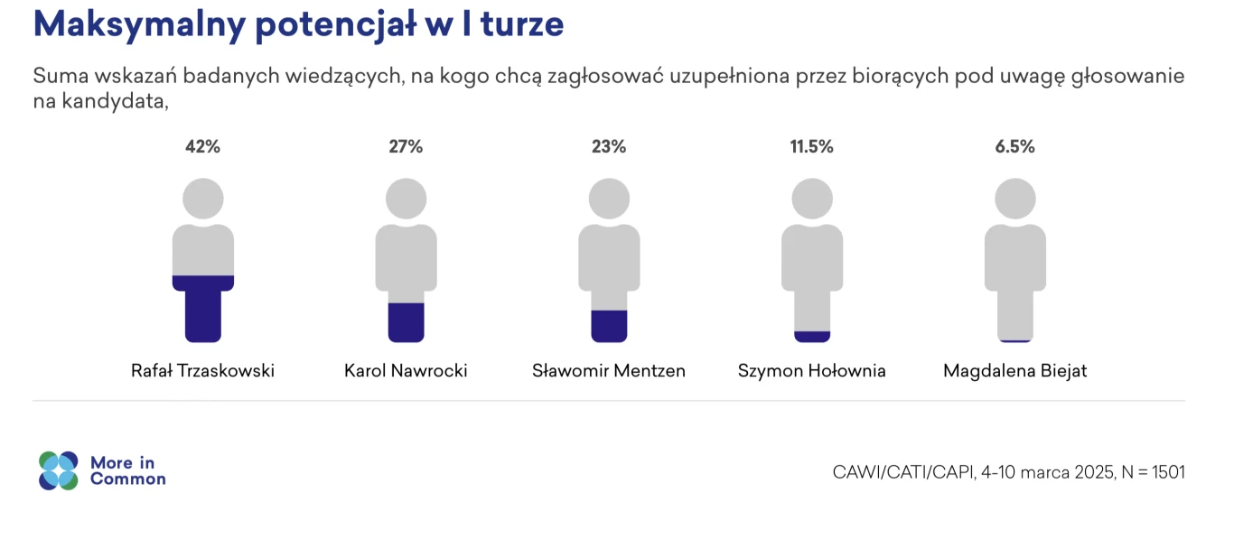 Autorzy badania w oparciu o odpowiedzi wyborców zdecydowanych i tych skłaniających się do poparcia któregoś ze startujących w prezydenckim wyścigu polityków oszacowali maksymalne poparcie czołowych kandydatów w pierwszej turze. W przypadku Trzaskowskiego jest to 42 proc. Sufit poparcia u Nawrockiego wynosi 27 proc., a u Mentzena - 23. Hołownia może liczyć na maksymalnie 11,5 proc., natomiast Biejat na 6,5.