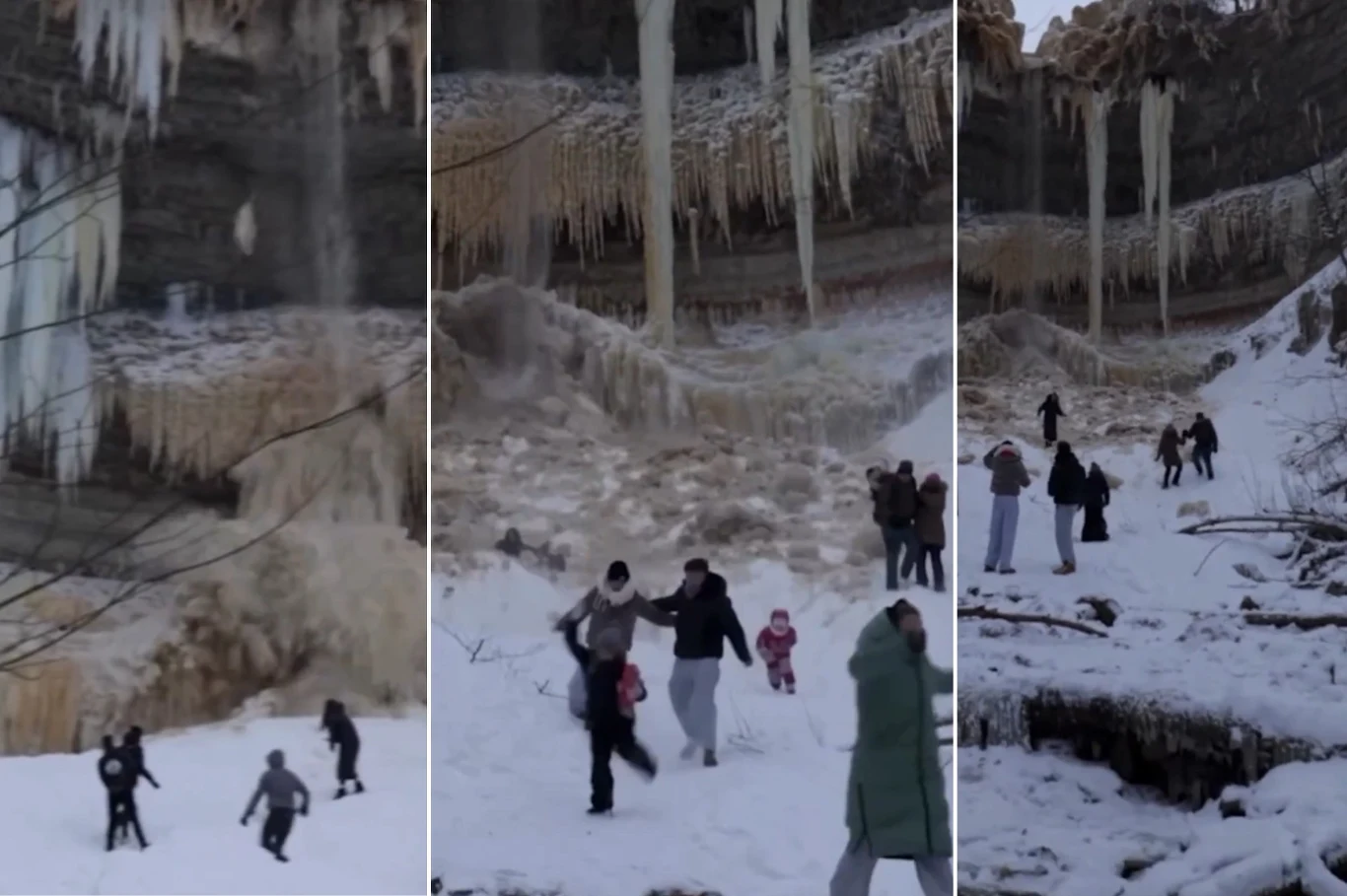 Tak było w sobotę, kiedy zawaliła się duża część jednego zamarzniętych sopli. Bryły lodu upadły tuż obok przebywających wtedy u podstawy wodospadu turystów. Wszystko widać a poniższym nagraniu: