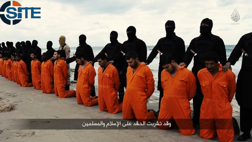 Egipcjanie, ubrani w pomarańczowe kombinezony, są prowadzeni przez terrorystów na plażę, następnie zmuszeni do uklęknięcia i ścięci.