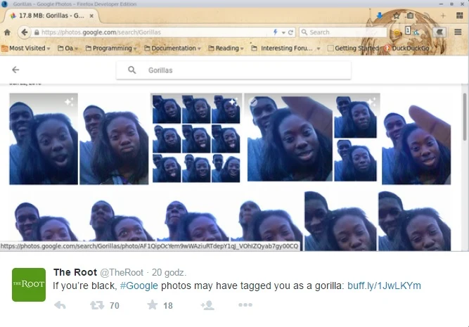 Firma Google, która intensywnie pracuje nad automatycznym rozpoznawaniem obiektów na zdjęciach, przeprosiła za przykrą wpadkę - jej algorytm uznał ciemnoskórą dziewczynę za... goryla. Problem powtarzał się w przypadku zdjęć innych czarnoskórych.